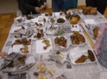 翌日も好天に恵まれ、絶好の観察会日和となりました。観察会は2つのコースに分かれて行いました。それぞれ、カラマツ林やカラマツとシラカバの混生林等が主体のコースで、様々な環境下に分布する菌類を観察することができました。特に、秋のカラマツ林を特徴づけるハナイグチのほか、チャナメツムタケやキヌメリガサなどが数多く採集されました。観察会の後、昼過ぎからは小海町観光案内所の2階にある公民館の一室をお借りし、鑑定会が行われました。連日の晴天で林内は乾燥気味だったため、きのこ類の発生状況が心配されましたが、最終的には86種の菌類を採集することができ、鑑定会場には参加者が採集した標本が所狭しと並びました。鑑定会は午後遅くまで続き、参加者は熱心に写真撮影や形態観察を行っていました。