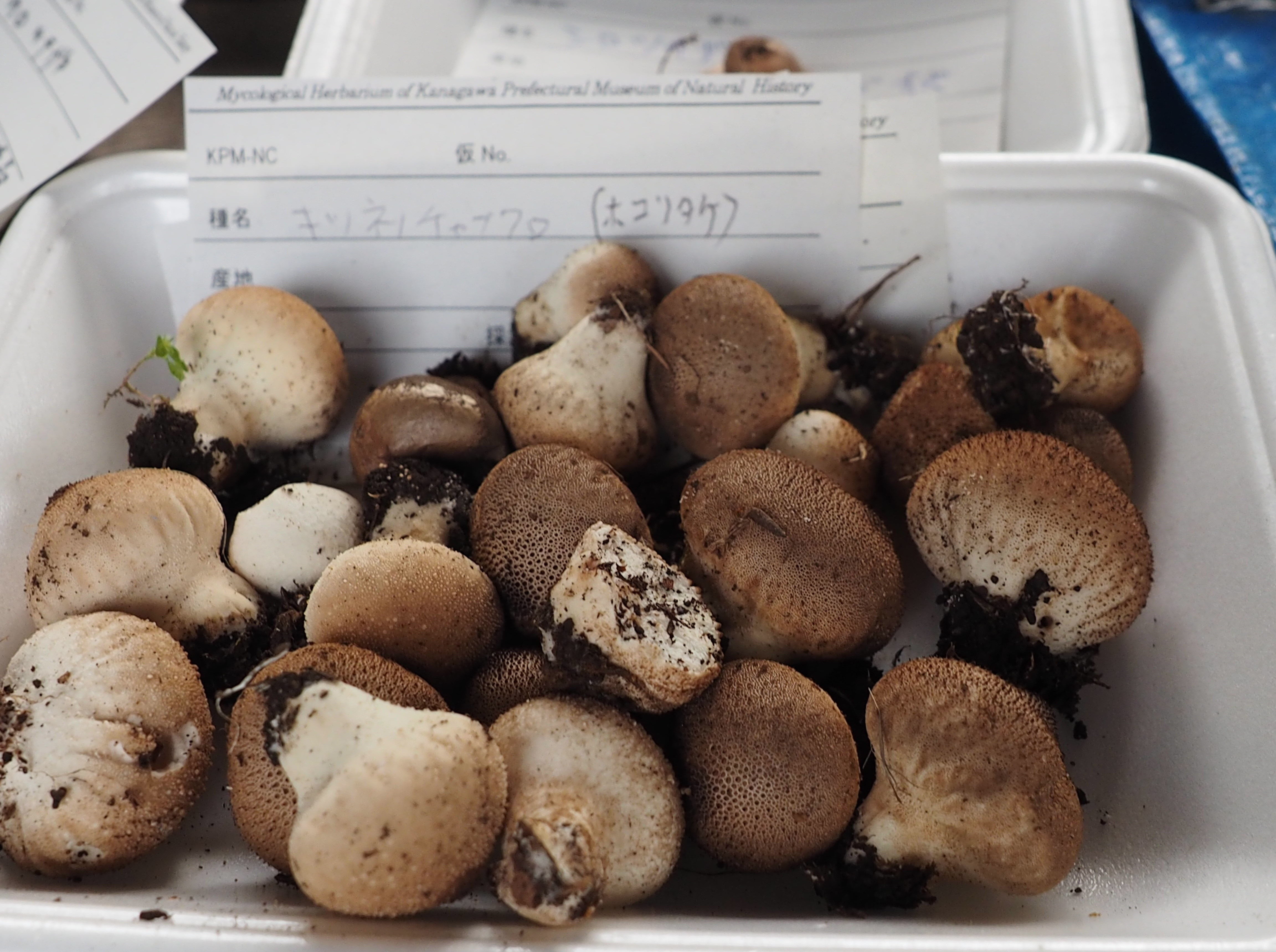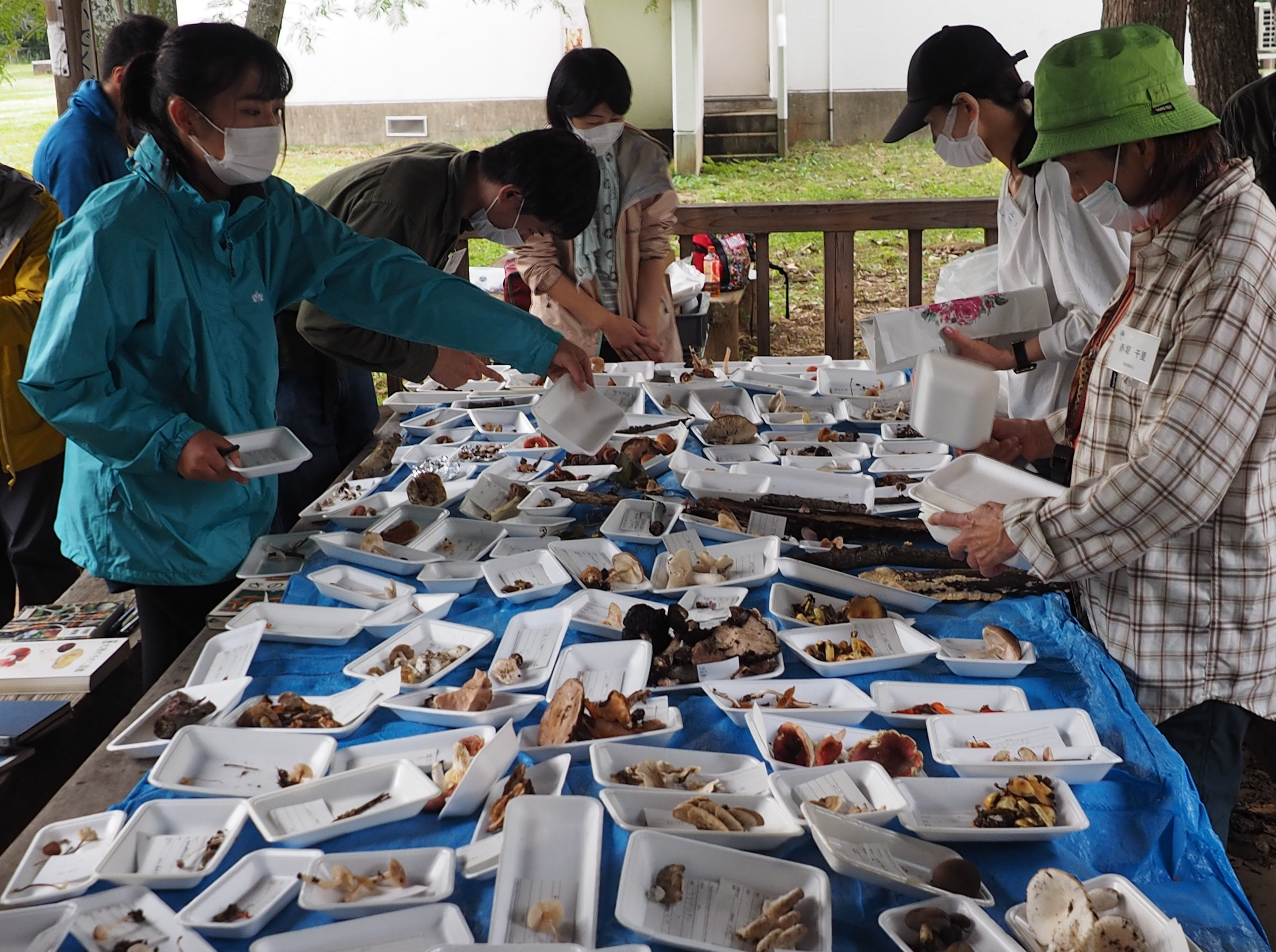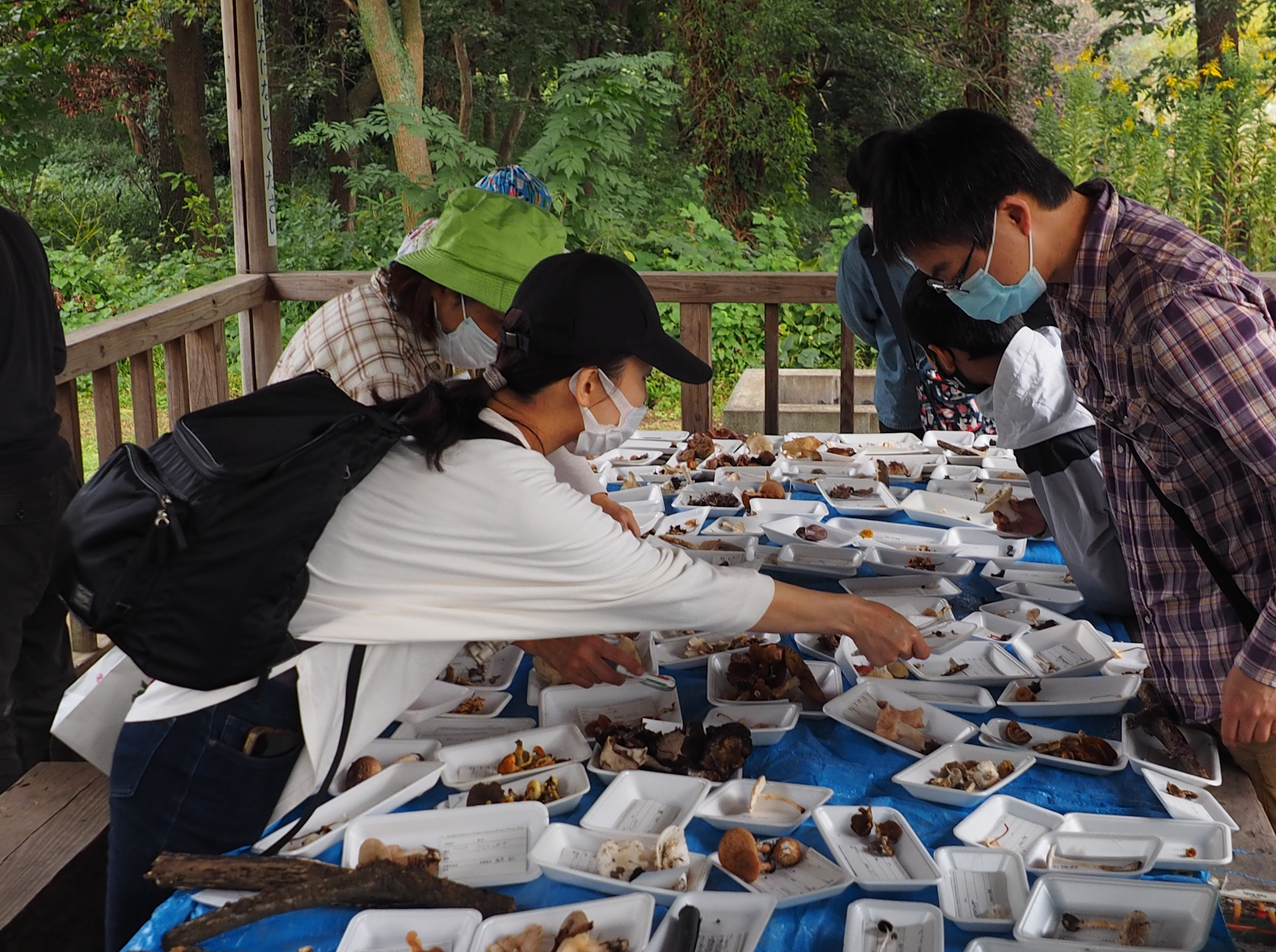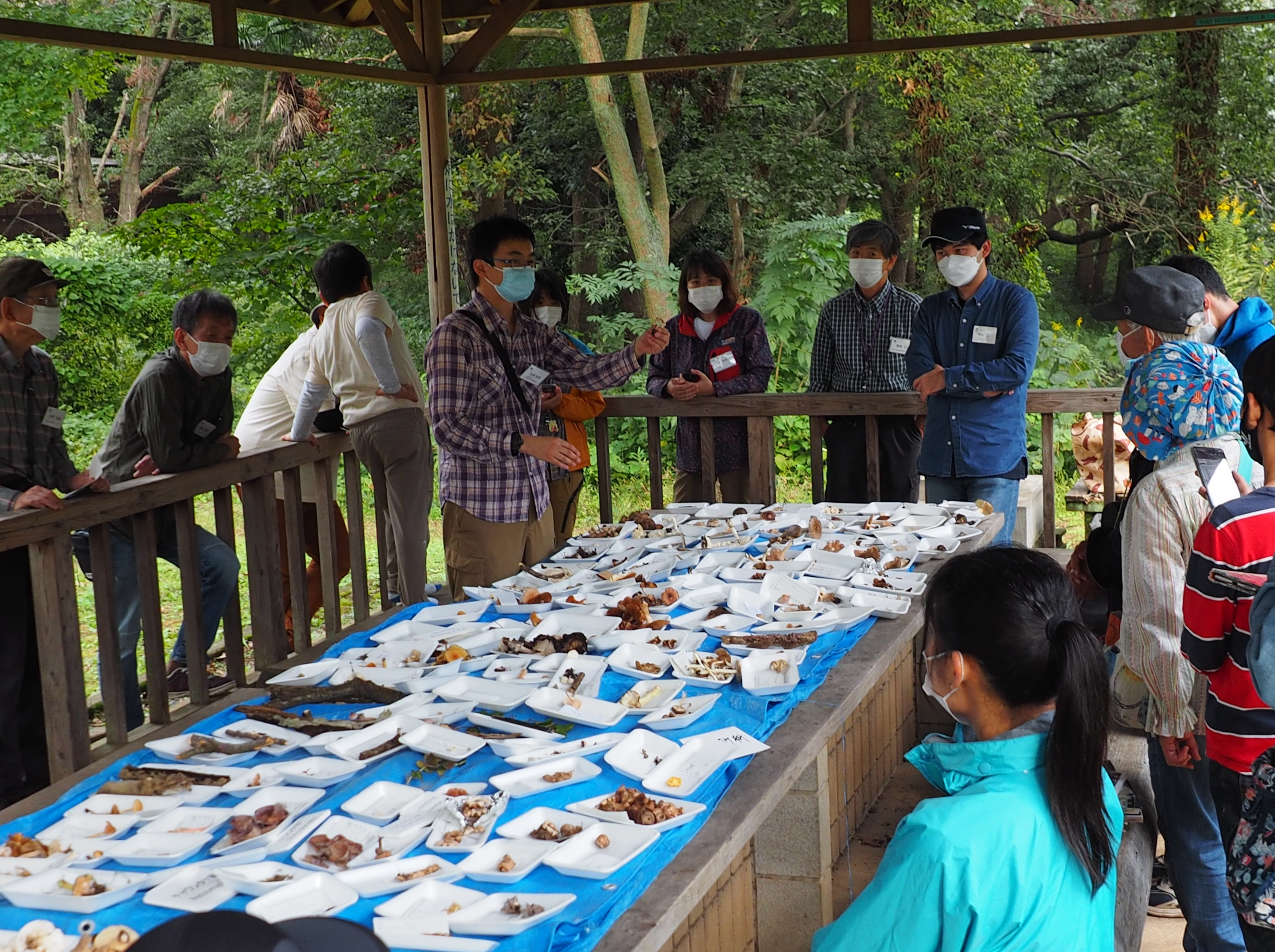 同自然公園では,主にクヌギ・コナラ等の二次林やシラカシ・マテバシイ林,ゴヨウマツ植林等の各種林内にて観察を行いました。午前中の野外観察の後,同公園内のあずまや付近にて各自,適切な距離を保ちつつ,持参した昼食をとった後,午後に鑑定会を行いました。鑑定会場には参加者が採集したたくさんの菌類が並び,合計72属116種もの種類が同定できました。鑑定会では,参加者は熱心に写真撮影,形態観察や意見交換を行っていました。採集された標本のうち,23点は神奈川県立生命の星・地球博物館に収蔵されました。その中にはヤミイロクヌギタケ,ユキホウライタケ,ヌメリハツ,ヒメツチグリ属菌(トガリフクロツチガキ,ケフクロツチガキ等)等の特筆すべき菌類も含まれ,その他にもツクツクホウシタケ,タケ類の仙人杖,7種のサビキン類等,多様な菌類を観察することができました。