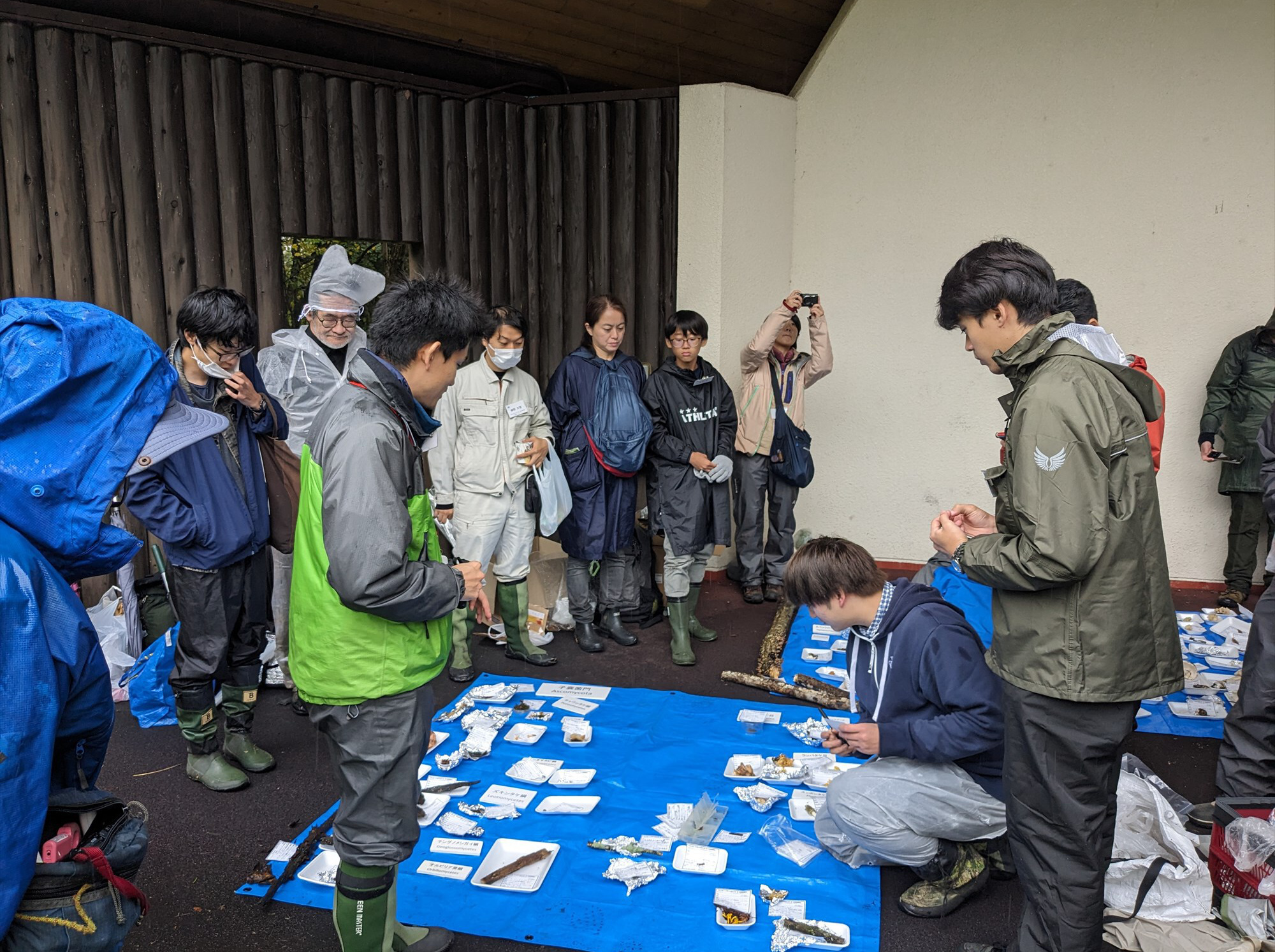 2日目は箱の森プレイパークに移動し、菌類観察会が実施されました。観察会場はコナラやアカマツ、モミなどの混交林のほか、芝生や水辺などもあり、それぞれの環境に適応した菌類の発生が期待できます。観察会は生憎の雨でしたが、各自が公園内を散策し、多くの菌類が採集されました。
