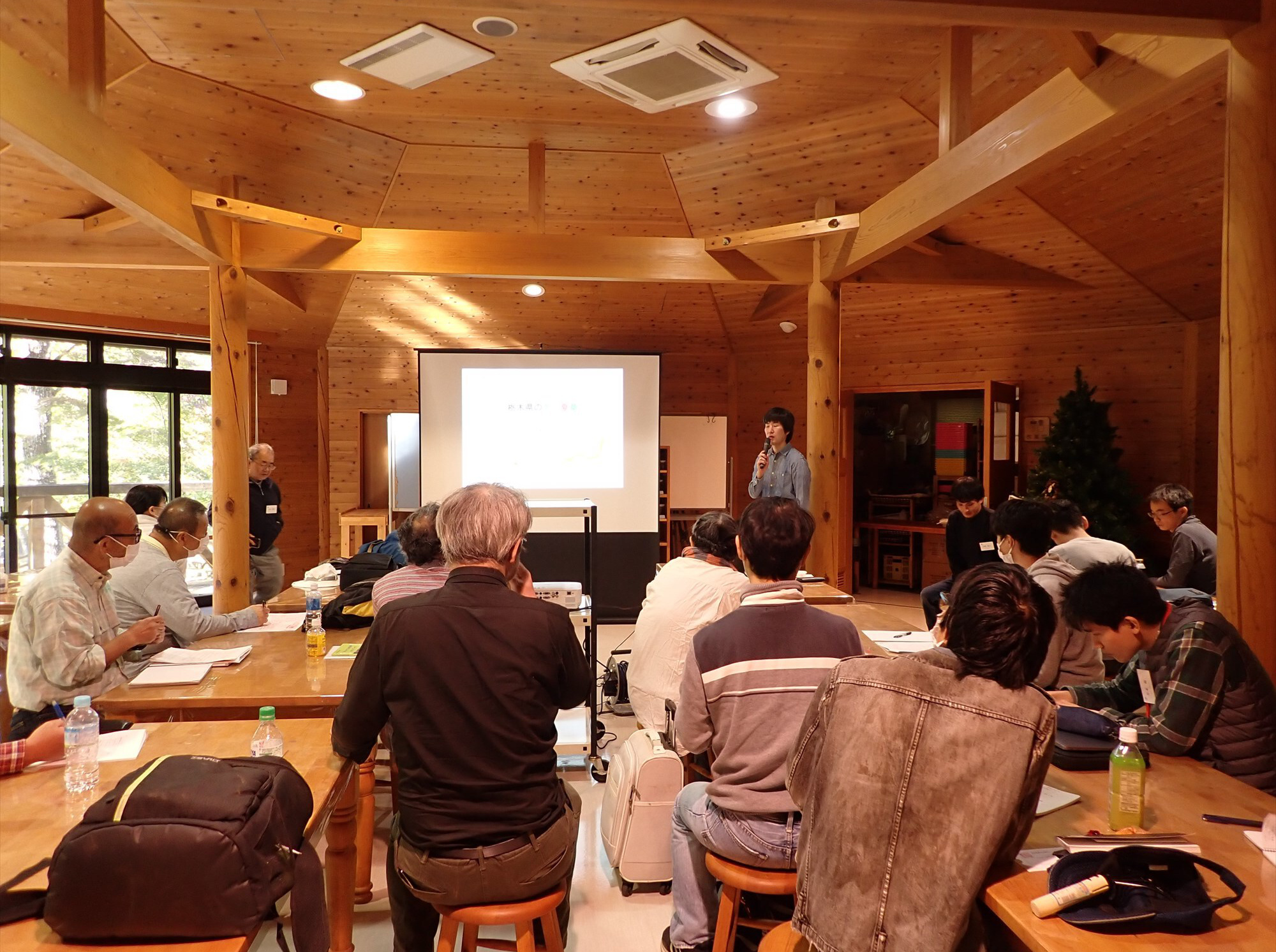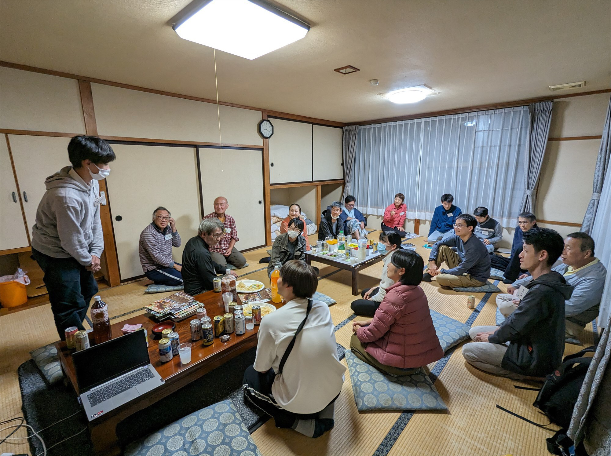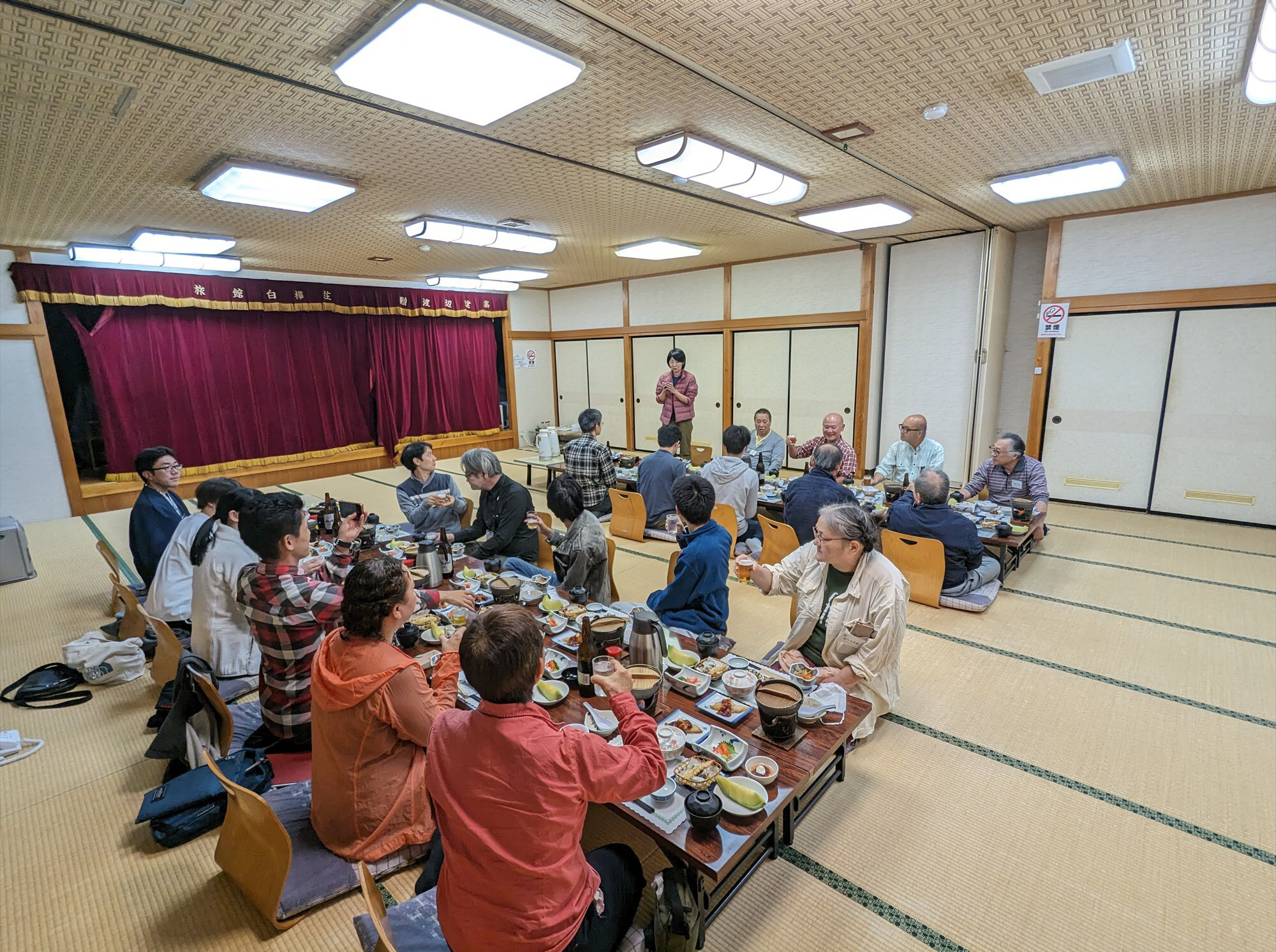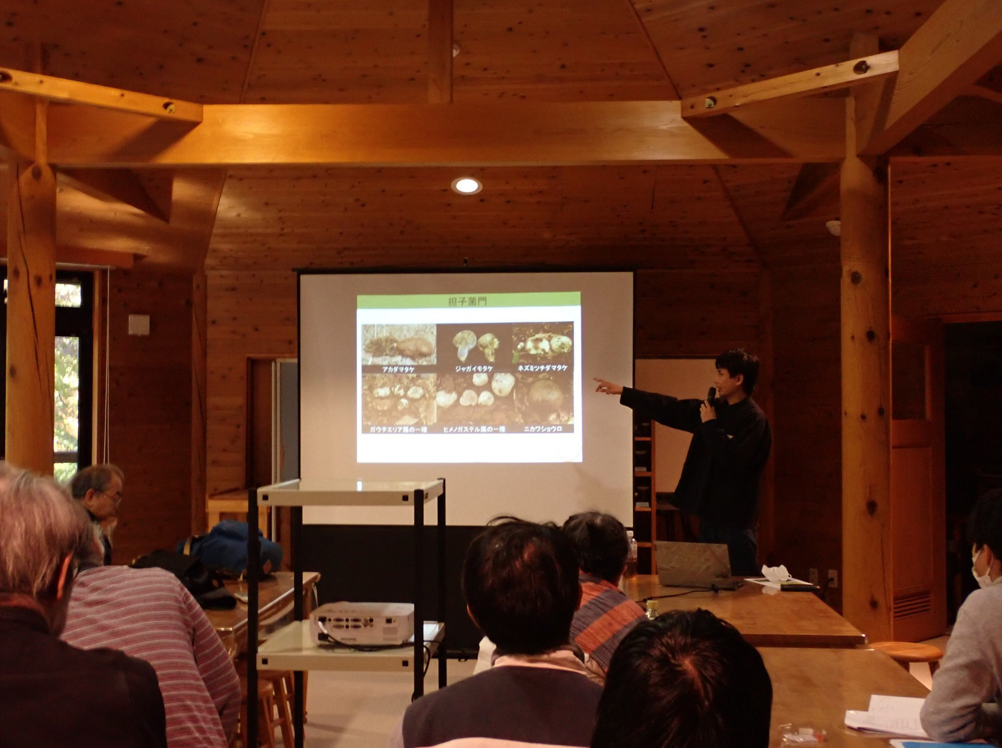講演会後は宿舎「湯荘白樺」に移動し、夕食となりました。その後、懇親会となり、参加者同士が話したり、モニターで菌類の写真を見せたりするなどして、夜遅くまで交流、意見交換がなされました。