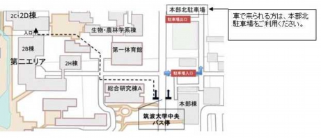 - つくばセンターから 「筑波大学循環バス(右回り、または左回り)」または「筑波大学中央」行(関東鉄道)乗車、「筑波大学中央」下車