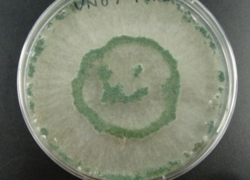 タイトル:トリコデルマもにっこりTrichodermaコメント:平板培地に生育した菌糸体上の分生子が偶然にヒトの顔のようになりました。 |