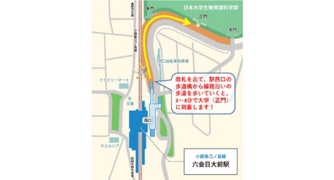 - 小田急電鉄・江ノ島線:「六会日大前」が最寄り駅です。各駅停車のみ停車しますので、快速急行や急行の場合は藤沢駅または湘南台駅でお乗り換え下さい。改札後、「西口」から線路に沿って徒歩約5分で正門に着きます。入構時の手続きは不要です。