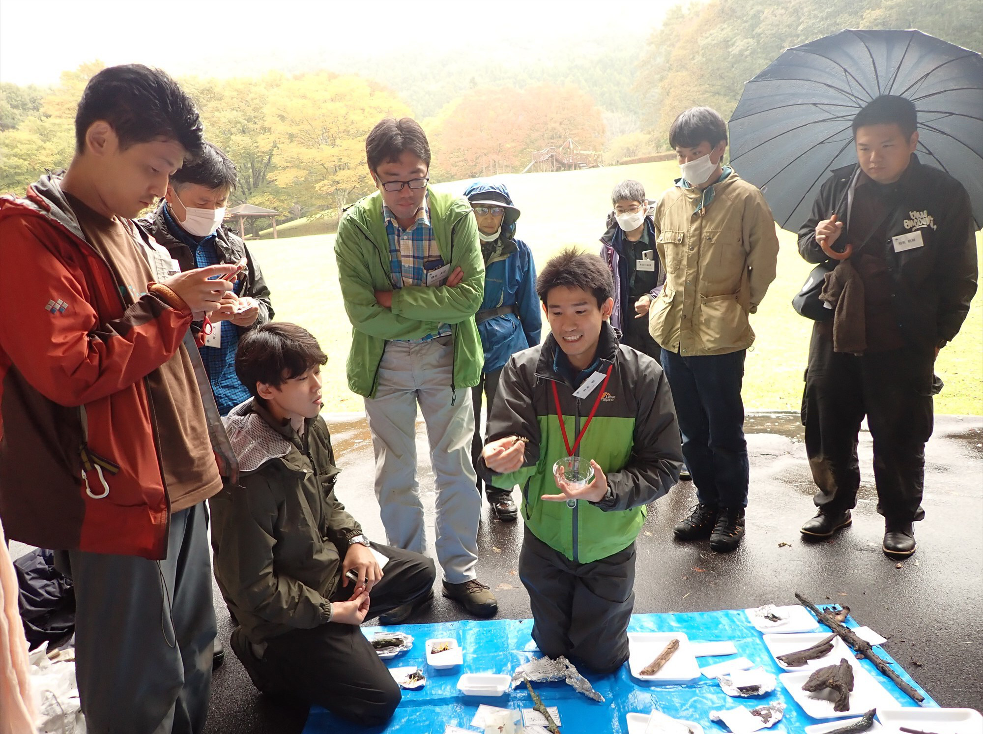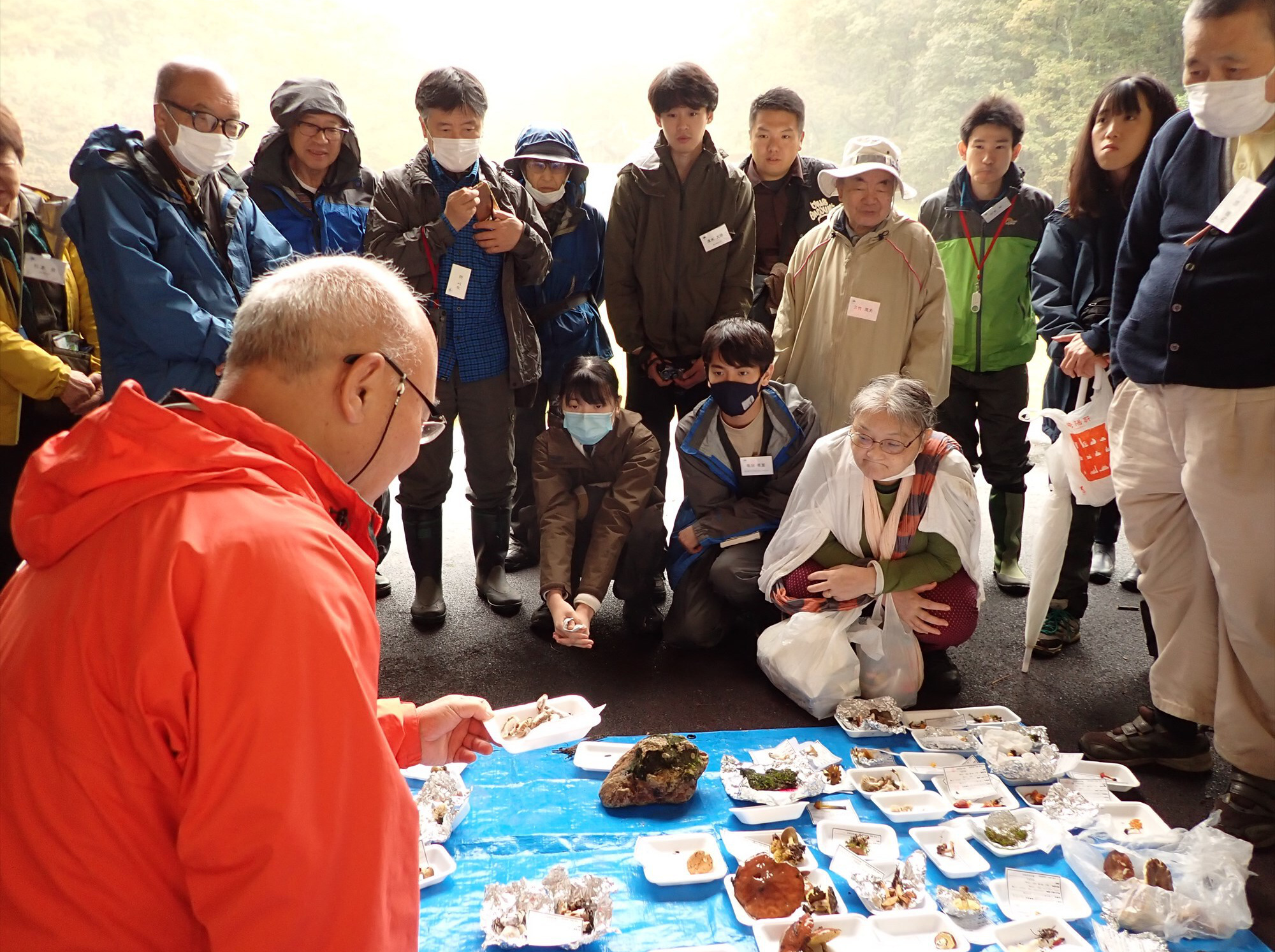 2日目は箱の森プレイパークに移動し、菌類観察会が実施されました。観察会場はコナラやアカマツ、モミなどの混交林のほか、芝生や水辺などもあり、それぞれの環境に適応した菌類の発生が期待できます。観察会は生憎の雨でしたが、各自が公園内を散策し、多くの菌類が採集されました。