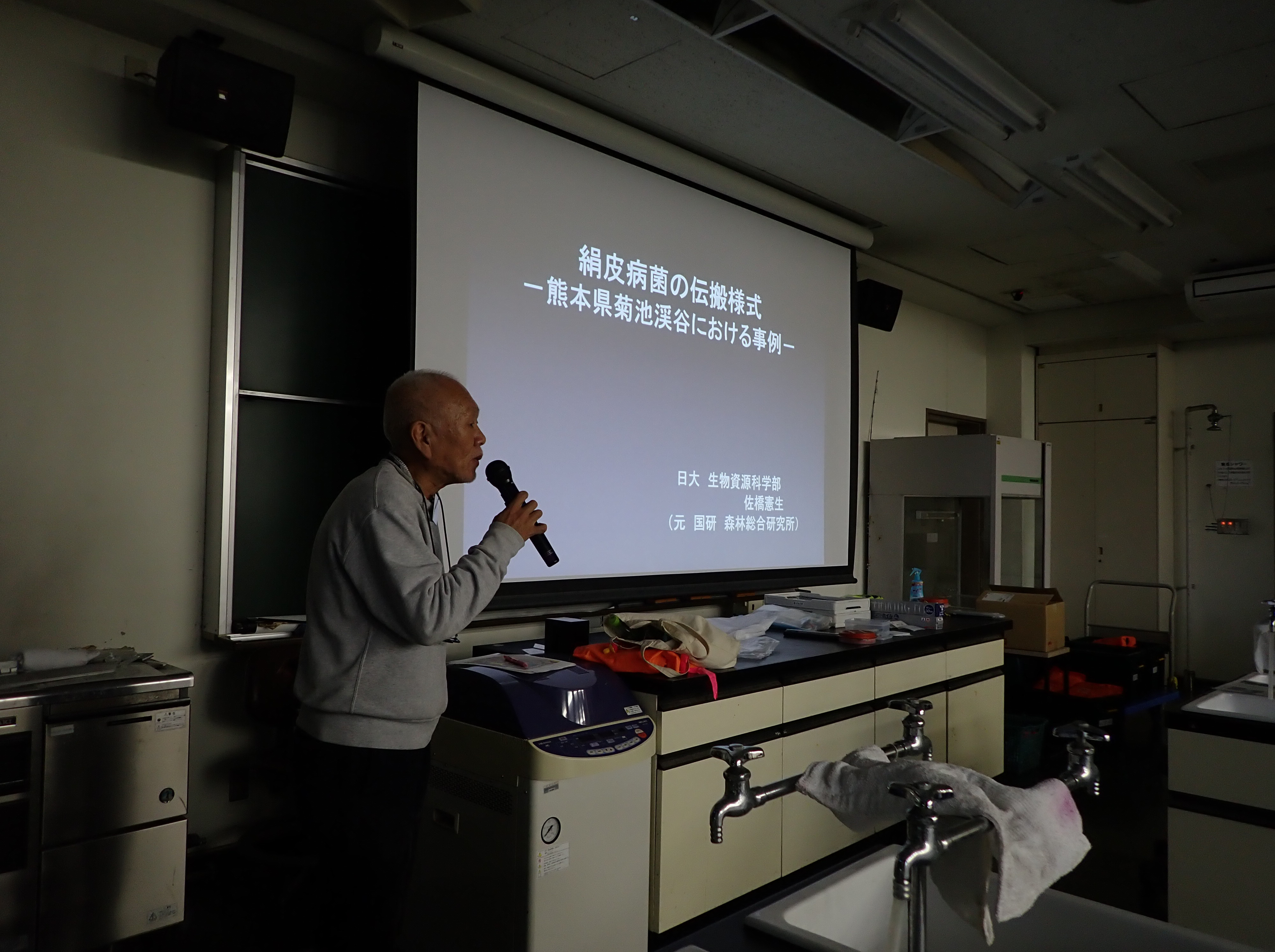 鑑定会後は、佐橋憲生博士(日本大学)による講演会「樹木を枯らす菌類の話―絹皮病と南根腐病の研究から」が行われました。樹木に病害を生じる菌類に関するトピックを紹介していただき、きのこ以外の視点からも菌類の知見を深める貴重な機会となりました。今年度も参加者の皆様のご協力のおかげで、無事に閉幕を迎えることができました。ご参加いただいた皆様、ありがとうございました。